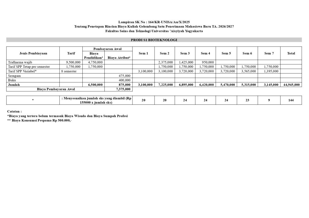 - Biaya tarif SPP Variabel adalah menyesuaikan jumlah SKS yang diambil. Biaya SKS Prodi Bioteknologi adalah Rp. 155,000. Jadi semisalnya mengambil 20 SKS maka : Rp 155,000 kali dengan 20 SKS menjadi total Rp 3,100,000
